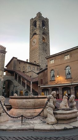 Piazza Vecchia con La Fontana Contarini, il palazzo della ragione e la Torre Civica detta “il campanone” che ancora oggi alle 22 scocca 100 colpi: quelli che in passato annunciavano la chiusura notturna dei portoni delle mura venete.