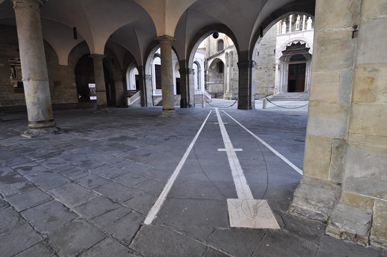 Sotto al loggiato di piazza vecchia è presente La Meridiana a camera oscura: a indicare la posizione del sole rispetto alla terra non è l’ombra ma un raggio di luce che penetra attraverso un foro nello scudo collocato tra le arcate.