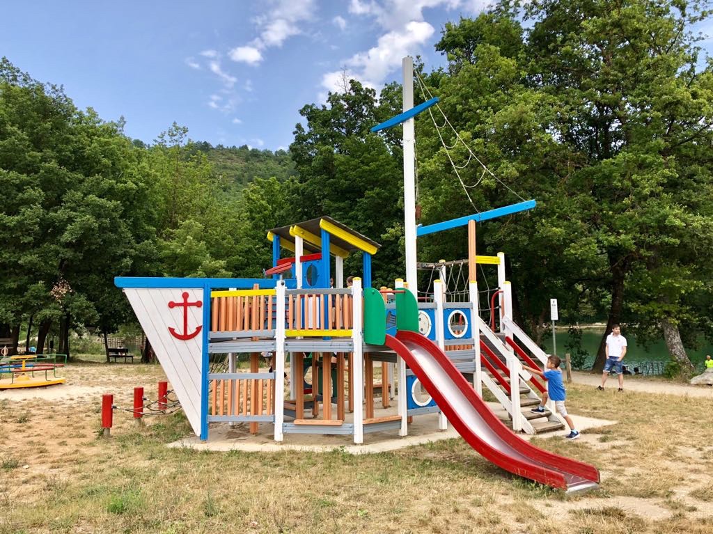 Per la gioia dei bambini è presente un curioso parco giochi a forma di nave e per la famiglia un barbecue ombreggiato, una zona picnic ed un bagno chimico. L’utilizzo dei tavoli comporta una spesa di 5€ per tutto il giorno.