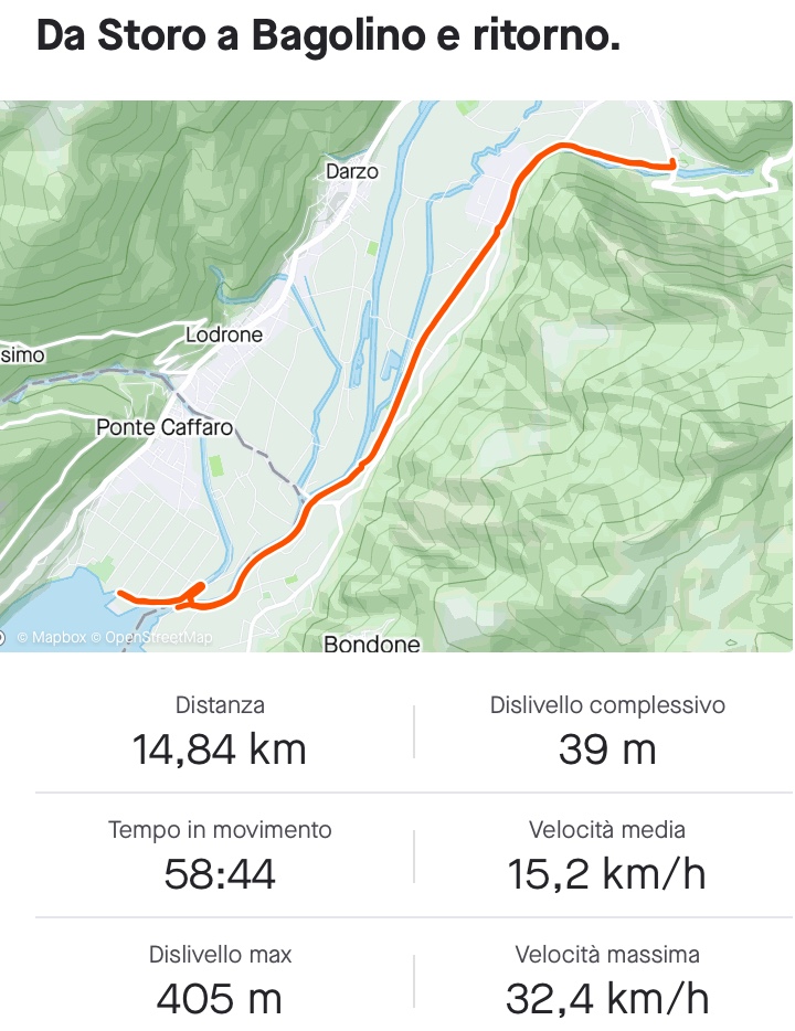 Partendo da Storo e arrivando a Bagolino si pedala per circa 15 km (andata e ritorno), il dislivello è di circa 39 metri, si attraversa un ponte coperto e due ponti normali.